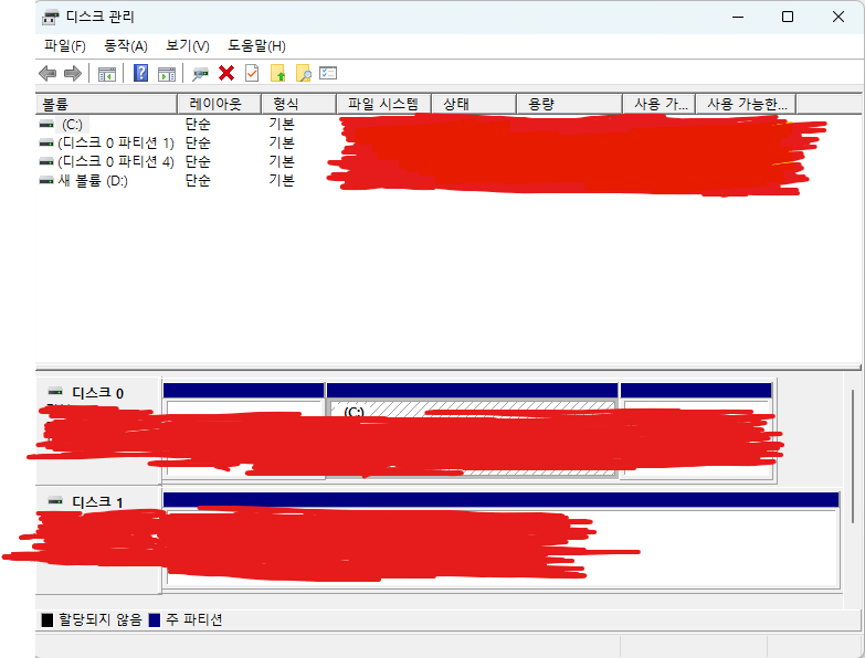 2. 디스크 관리 도구에서 디스크 목록을 확인합니다. 여러 개의 디스크가 있는 경우 번호로 식별될 수 있습니다. 예를 들어, "디스크 0" 또는 "디스크 1"과 같은 형태로 표시됩니다.