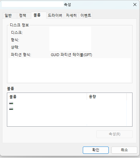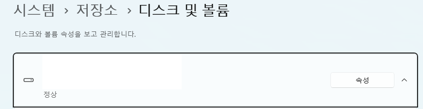 2. 디스크 및 볼륨에서 '속성' 버튼 클릭!